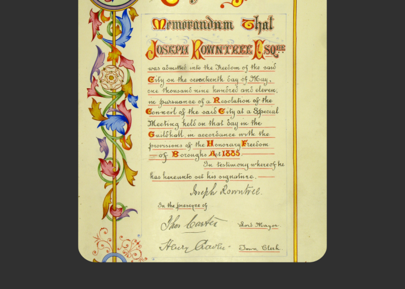 In May 1911, York conferred the Freedom of the City on Joseph. This was the highest honour within its power and recognised Joseph’s contribution to the city as an industrialist, reformer and public servant. Ever the campaigner, Joseph took the opportunity at the end of his speech to remind those present that poverty and destitution were still a depressing reality for many working class families in York.